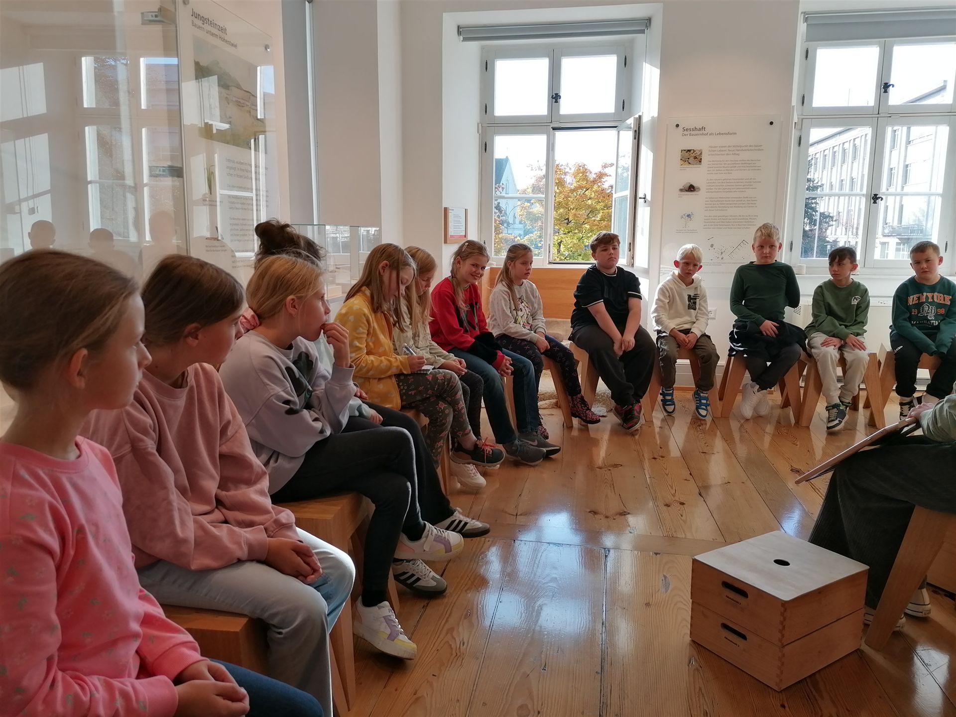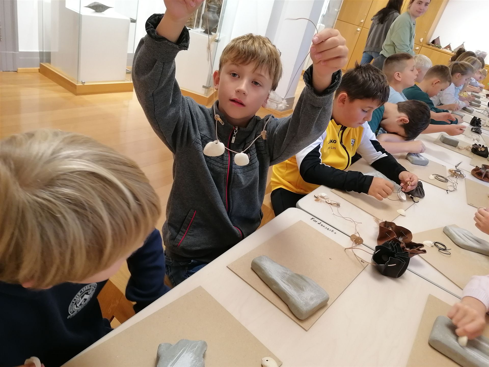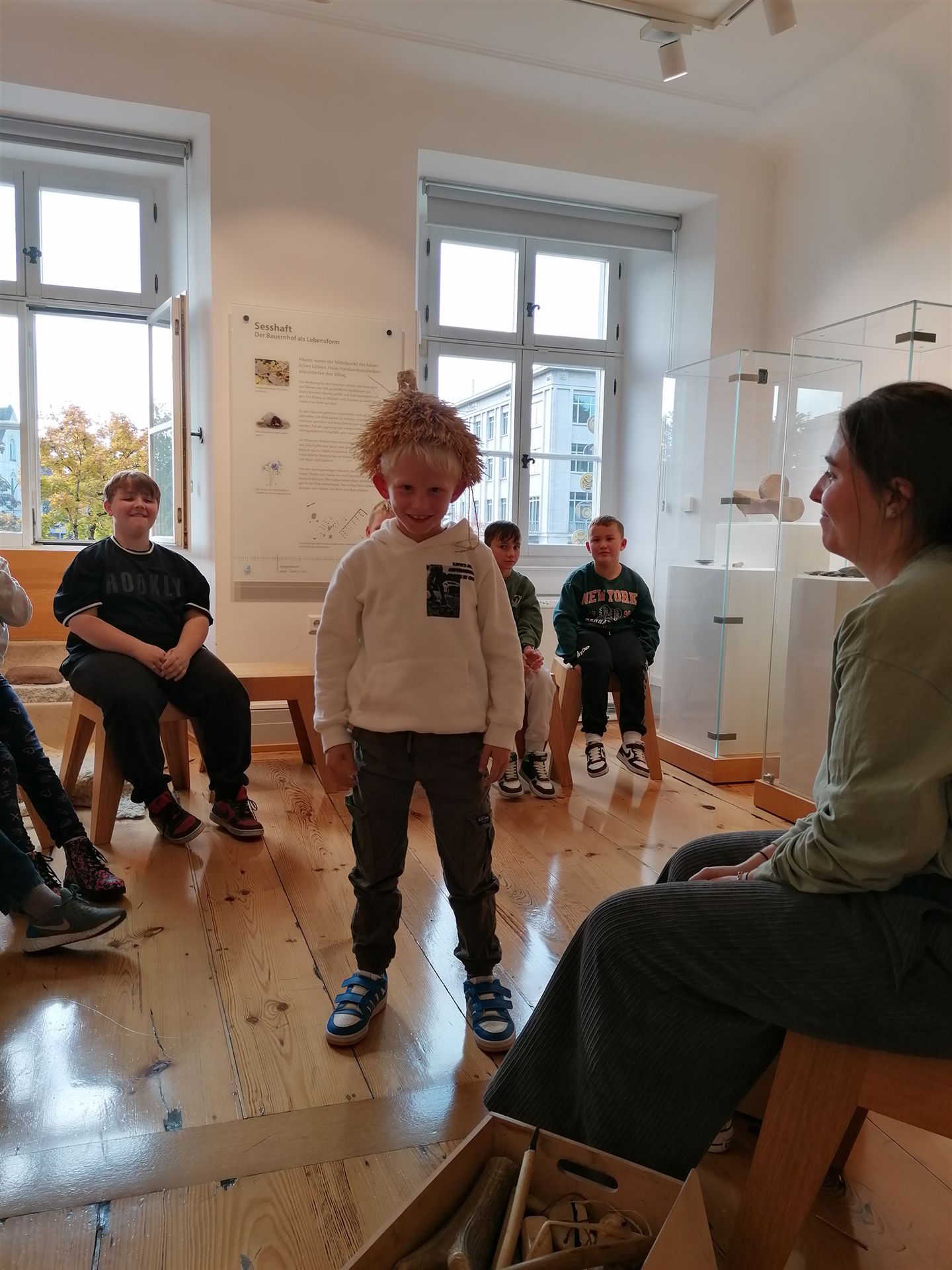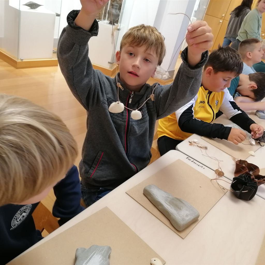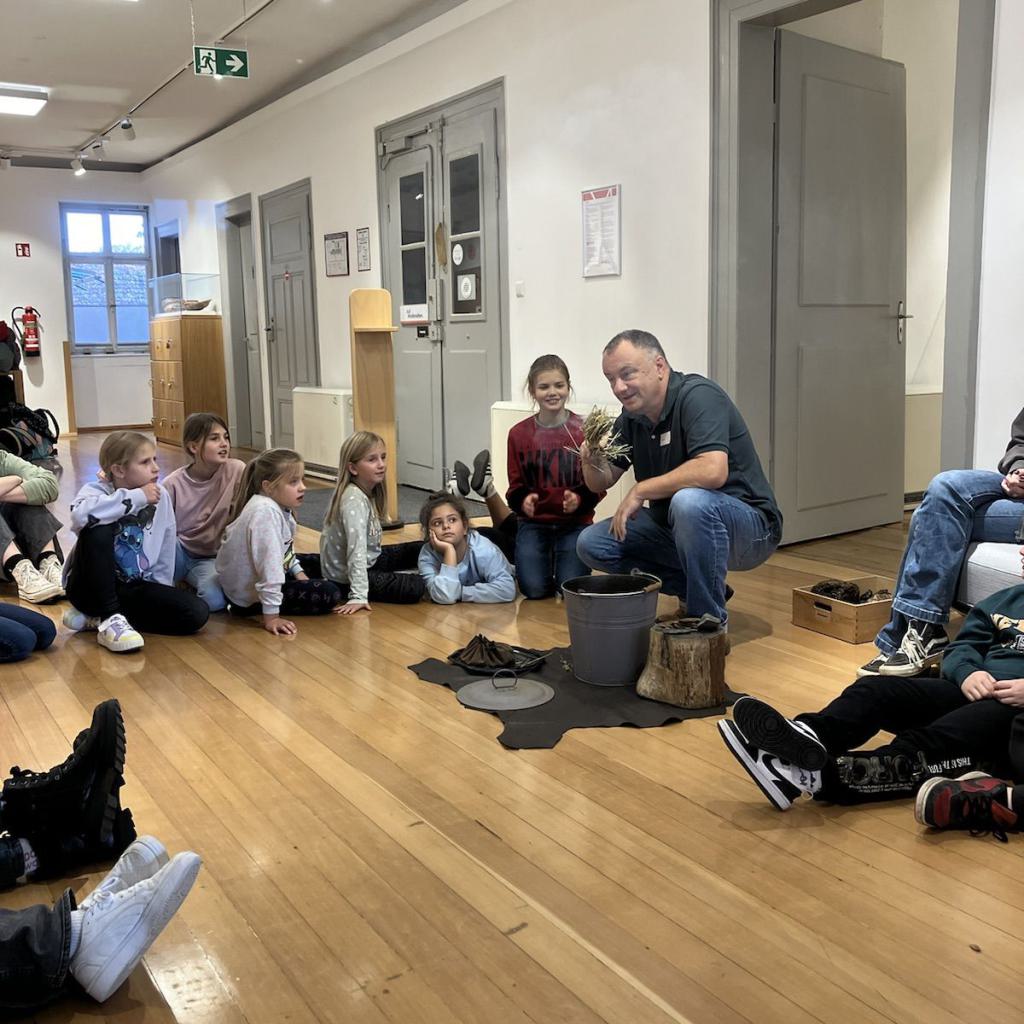 Mit dem Bus ging es für uns nach Singen ins Hegau Museum. Dort durften wir allerlei Spannendes über die Jungsteinzeit erfahren und sogar selbst erleben. Gemeinsam wurde ein steinzeitliches Feuer entfacht, was alle faszinierte. Als Highlight durfte jedes Kind ein eigenes Amulett anfertigen und selbst erleben, wie hart das damalige Leben gewesen sein musste.