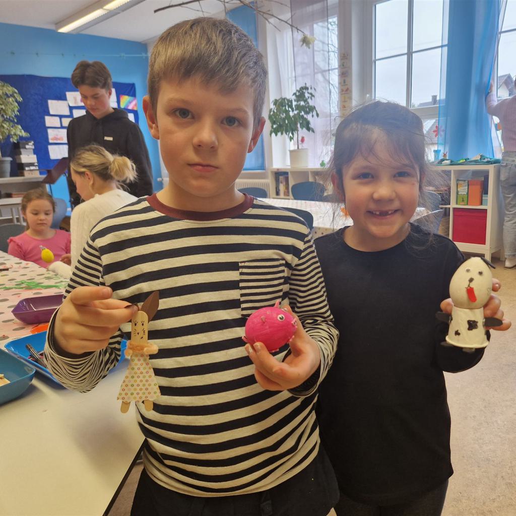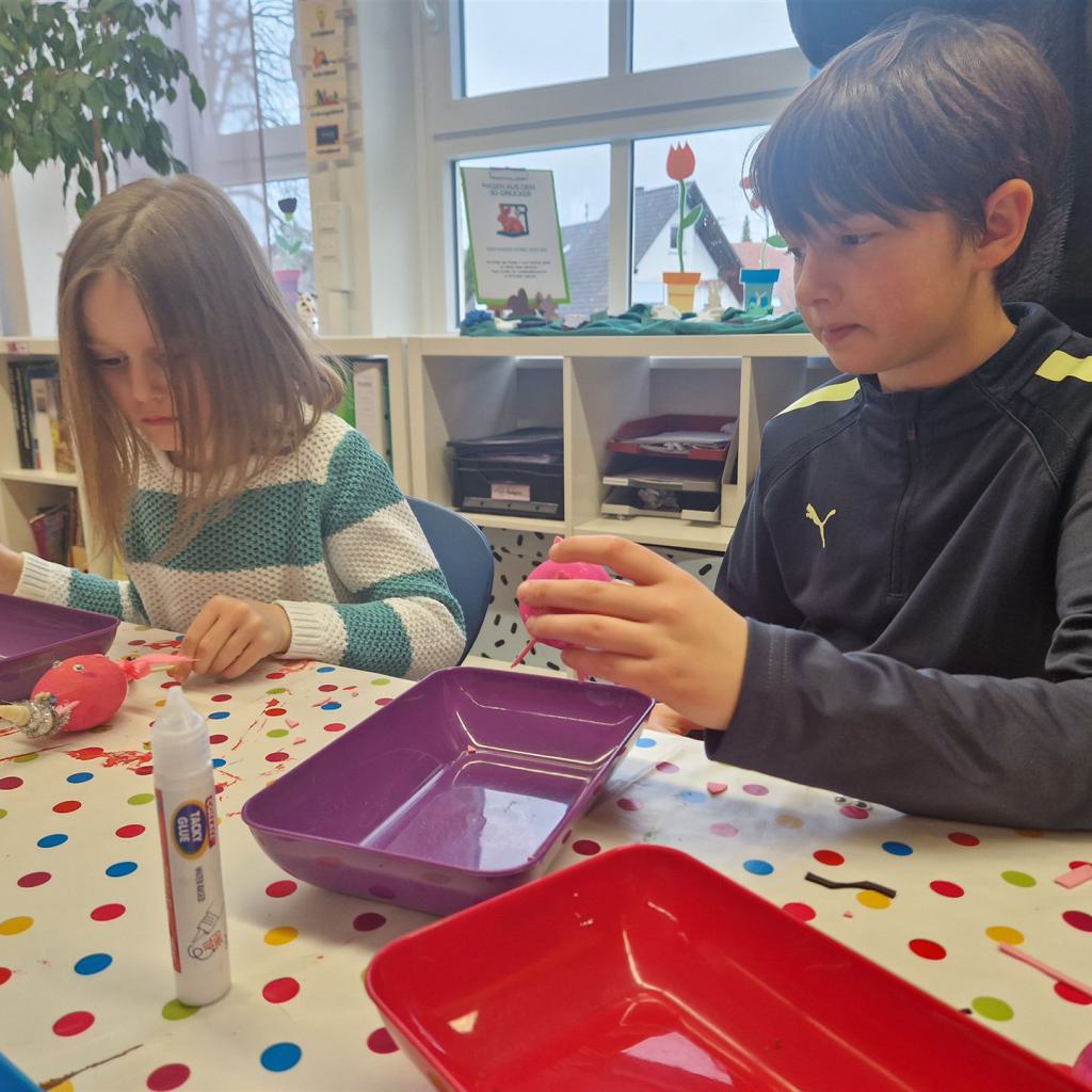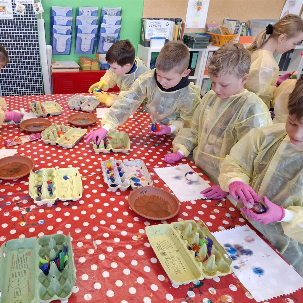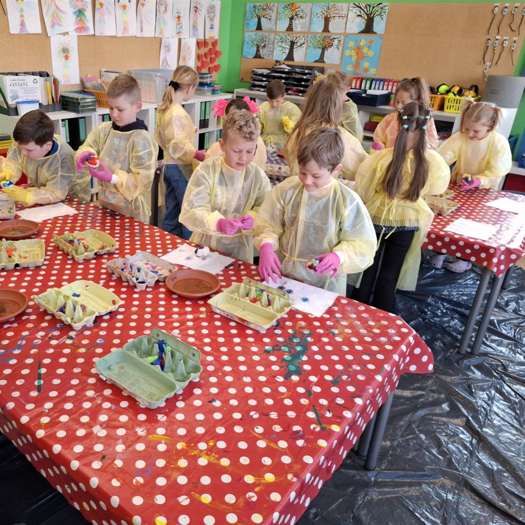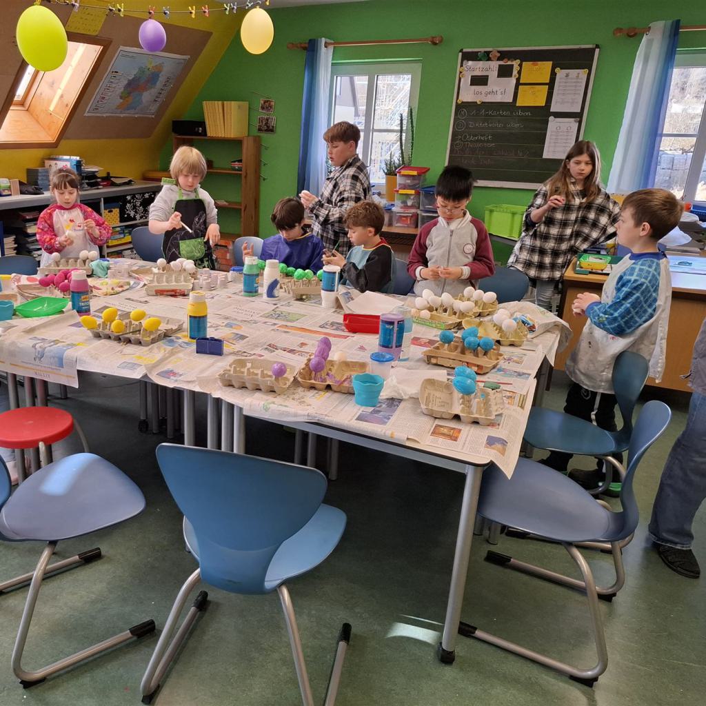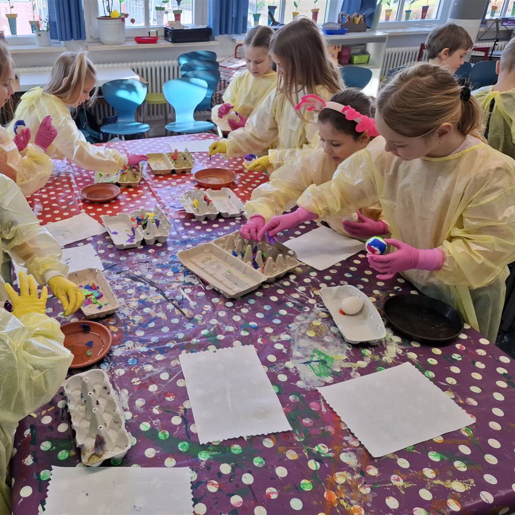 Mit viel Kreativität und Begeisterung nahmen die Kinder an den zahlreichen Bastelangeboten rund um Ostern teil. Ein besonderes Highlight waren dabei die wunderschönen Puteneier, die uns freundlicherweise von Frau Keller zur Verfügung gestellt wurden – herzlichen Dank dafür! Die Eier wurden mit viel Fantasie gestaltet: Ob als niedliche Tiere oder kunstvoll mit Seidenpapier verziert – jedes einzelne war ein kleines Kunstwerk.
