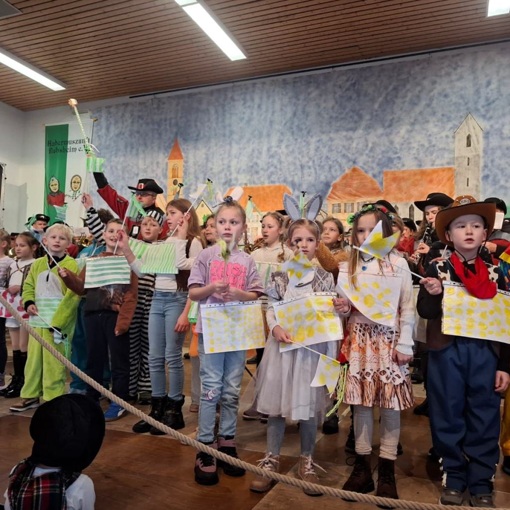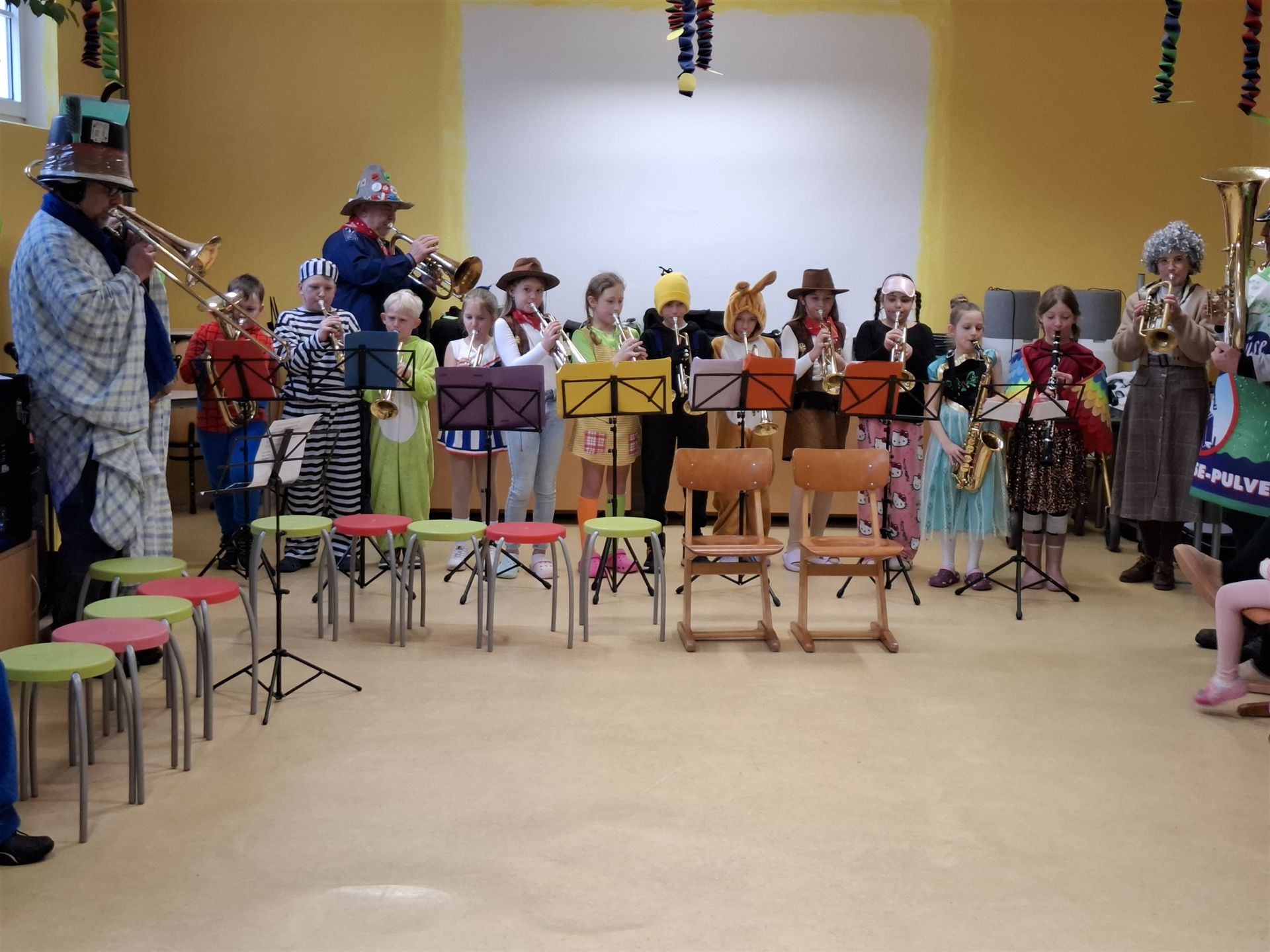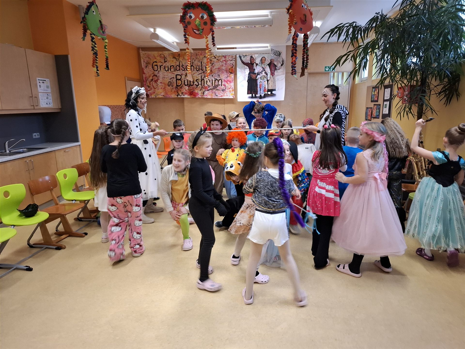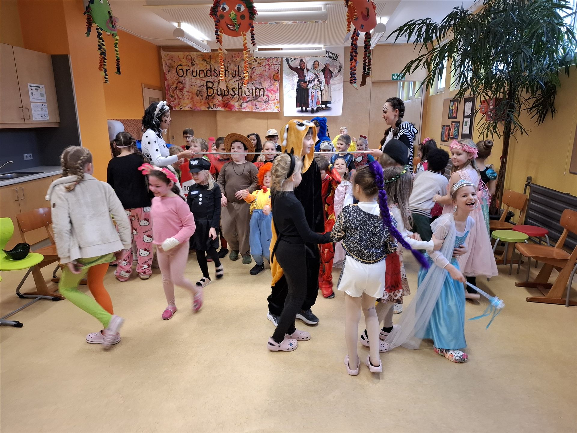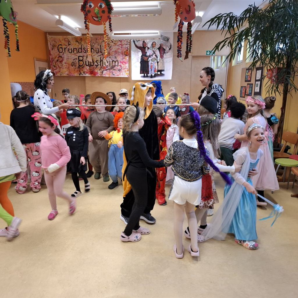 Anschließend schlängelte sich eine lange Polonaise durchs Schulhaus und alle trafen sich zur großen Party im Multiraum. Bei fröhlicher Musik wurde getanzt und gesungen. Für die passende närrische Stimmung sorgte unsere Bläserklasse mit dem traditionellen Narrenmarsch.