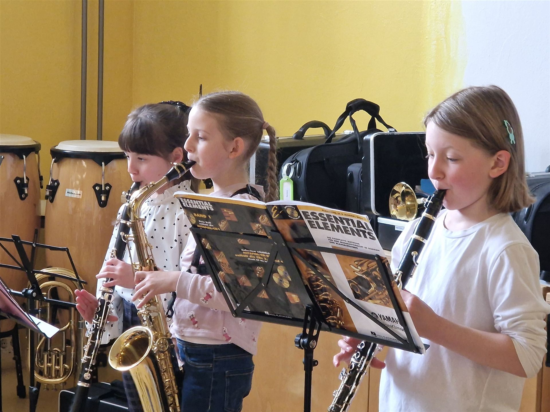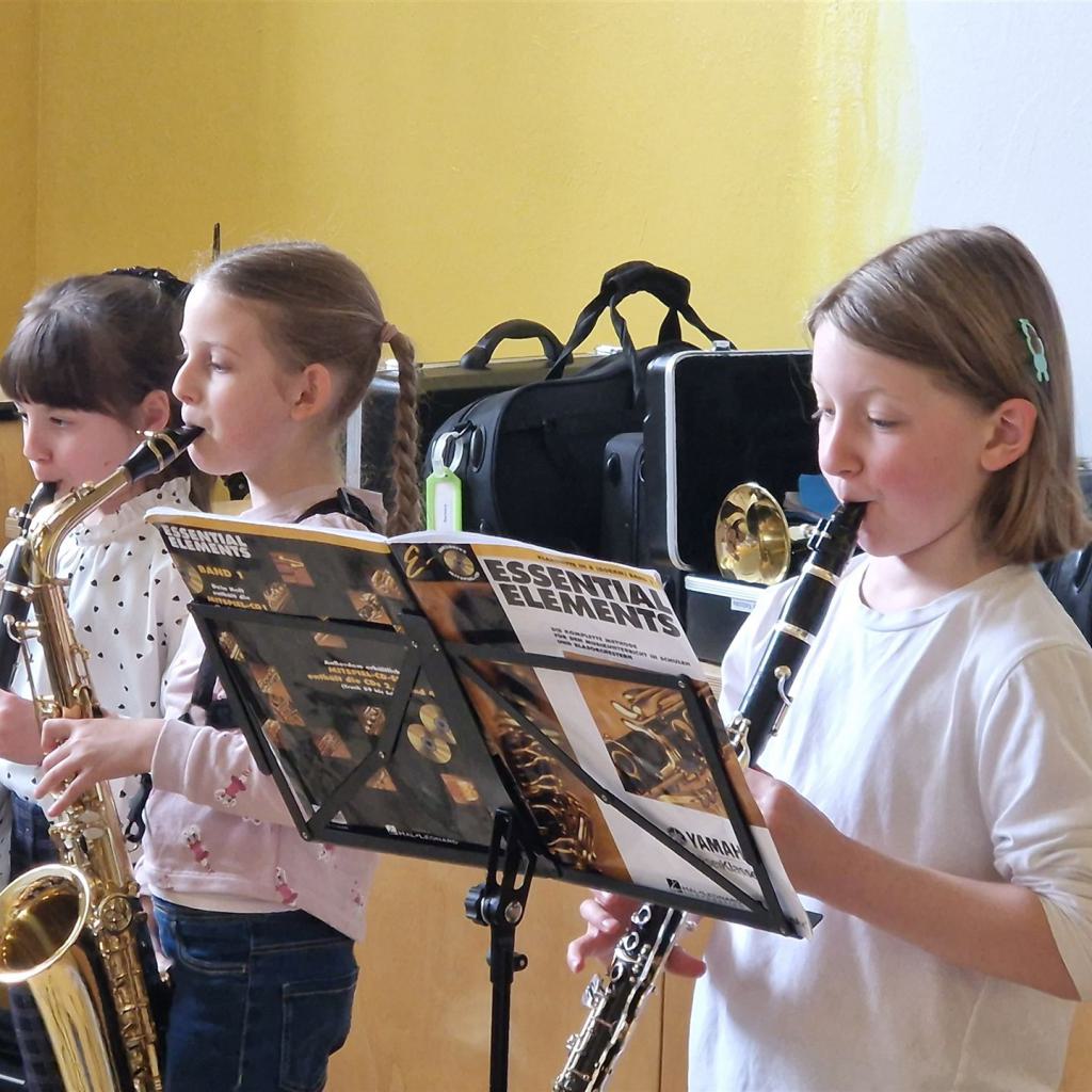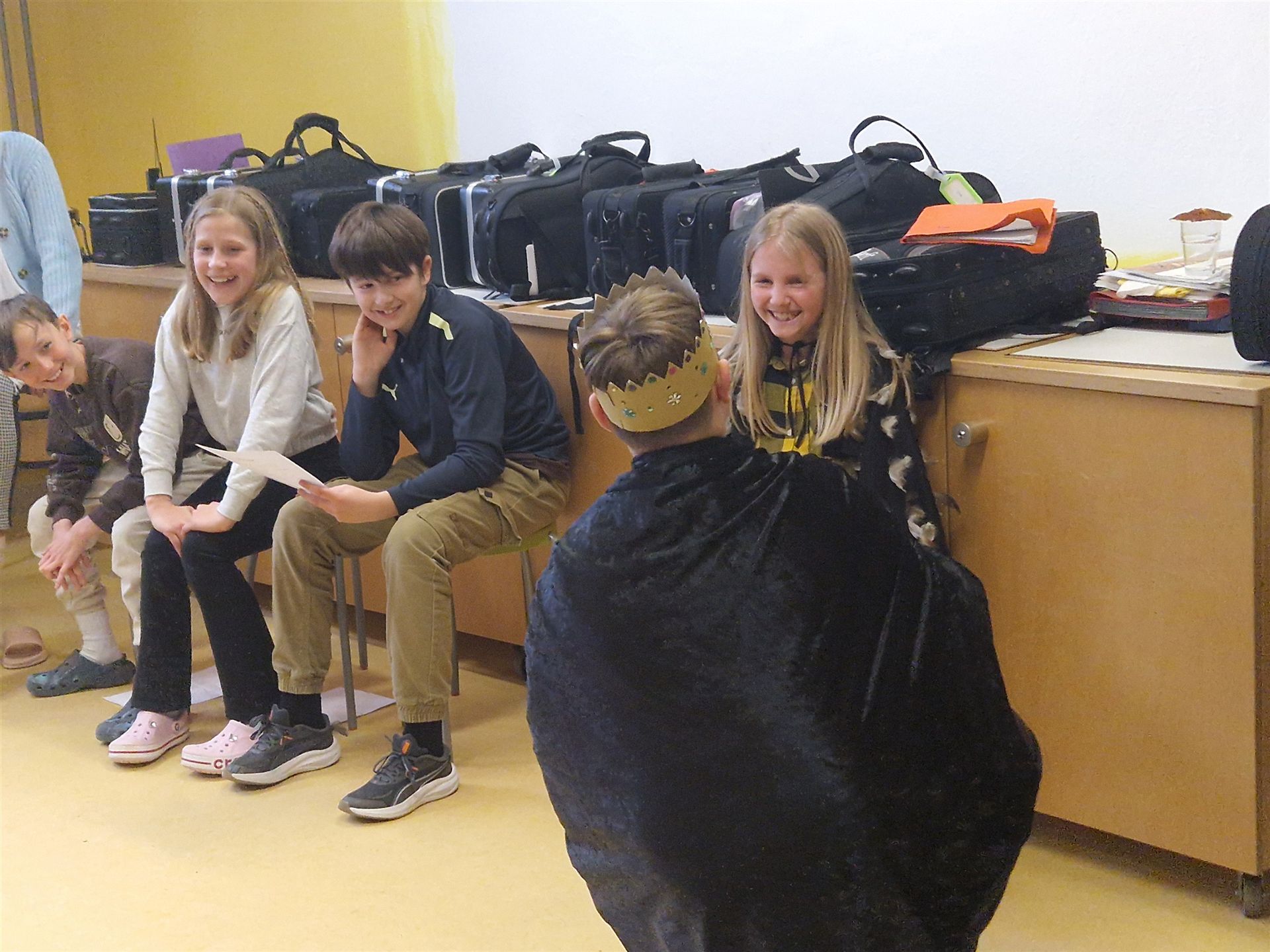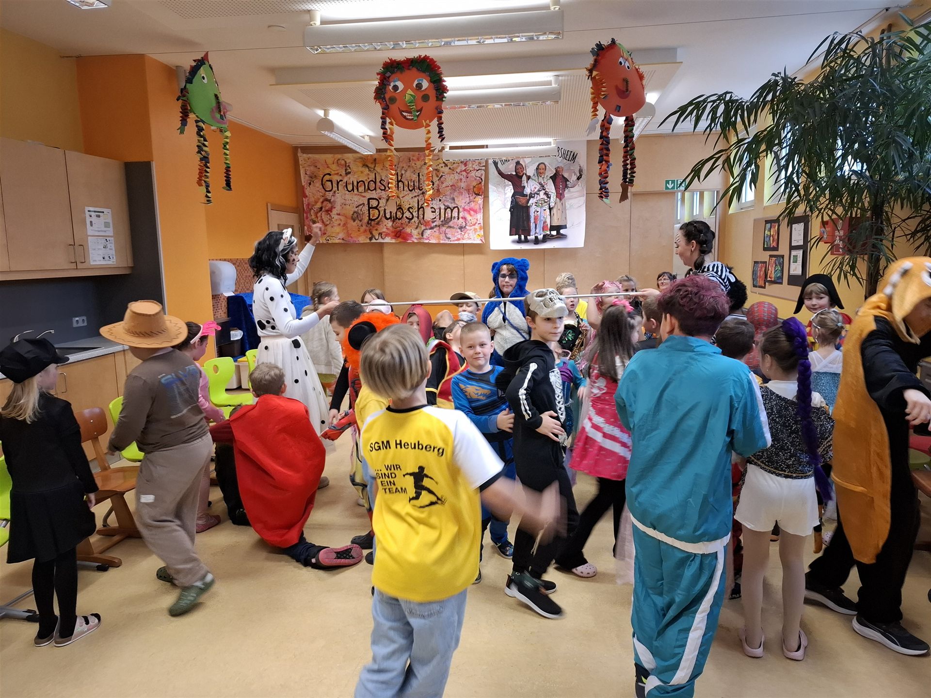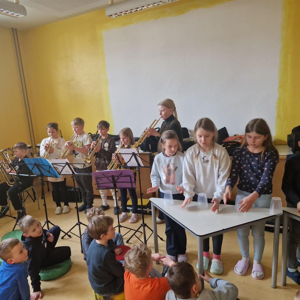 Anschließend schlängelte sich eine lange Polonaise durchs Schulhaus und alle trafen sich zur großen Party im Multiraum. Bei fröhlicher Musik wurde getanzt und gesungen. Für die passende närrische Stimmung sorgte unsere Bläserklasse mit dem traditionellen Narrenmarsch.