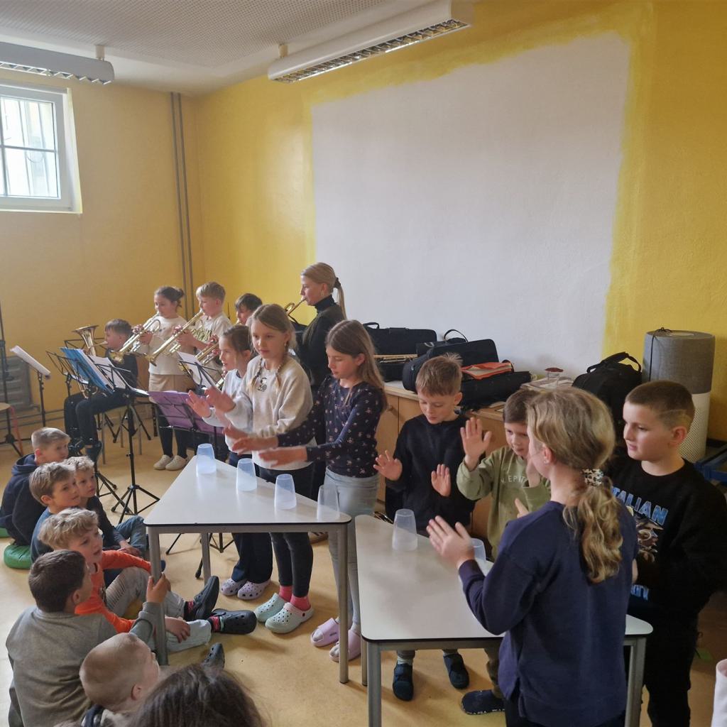 Bei der diesjährigen Dorfputzede hat die Grundschule ein Preisgeld für das kreativste Bild erhalten. Blubbi, das Maskottchen der ENRW, kam extra angereist um uns den Preis zu übergeben. Vielen herzlichen Dank dafür. Das Preisgeld haben wir in neue Blasinstrumente investiert. Ganz nach dem Motto: "Wir blasen der Umweltverschmutzung den Marsch!"