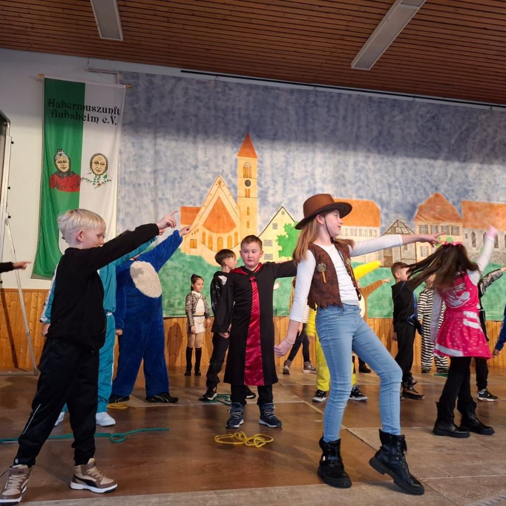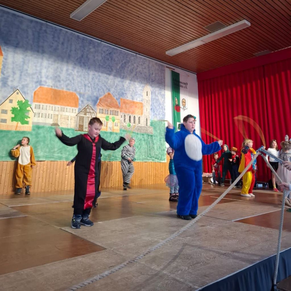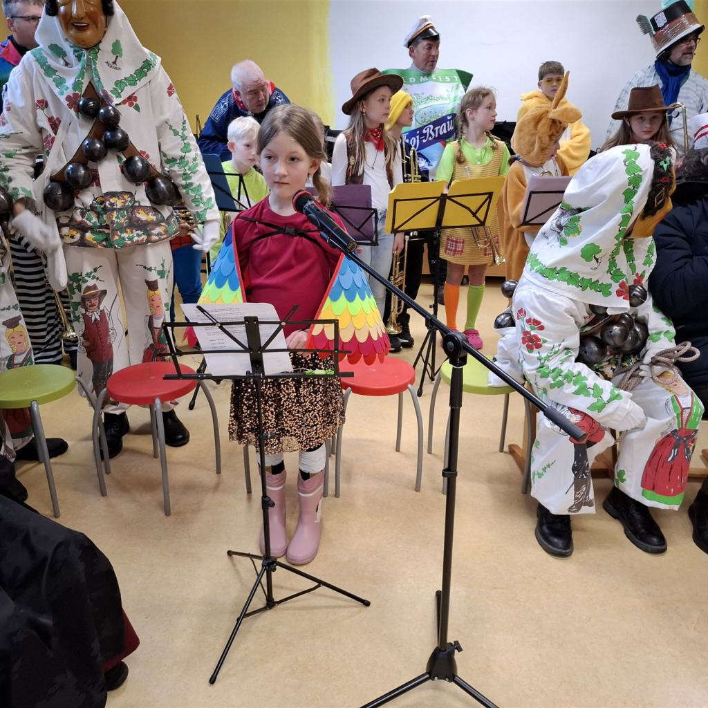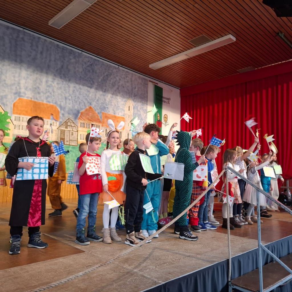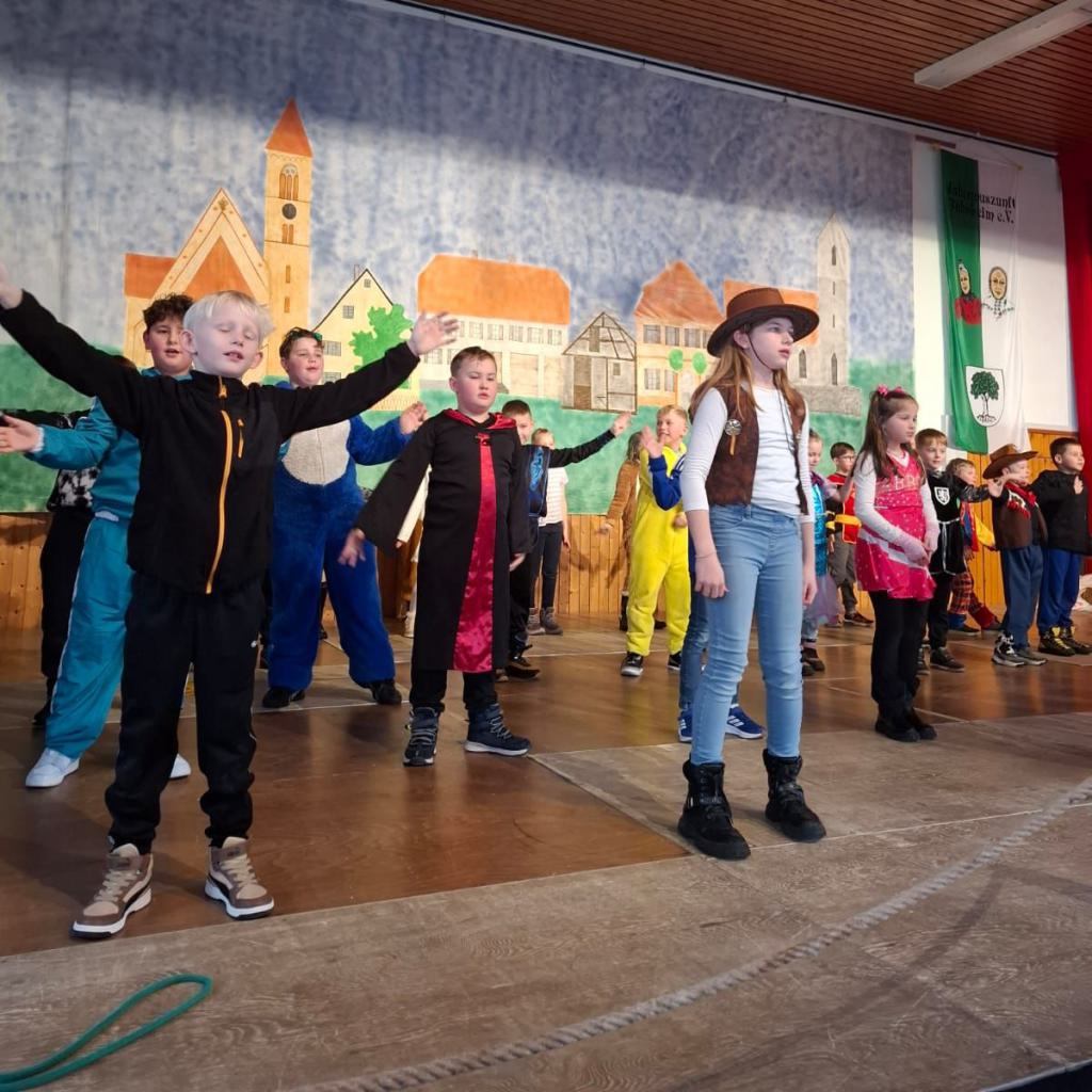 Am Rosenmontag machte sich die Schulgemeinschaft dann auf den Weg zur Halle. In einem kleinen Umzug zogen die Kinder fröhlich dorthin, begleitet von einigen Windböen. Auf der Bühne führten sie das Lied vom Anderssein auf und begeisterten mit einem tollen Tanz das Publikum.