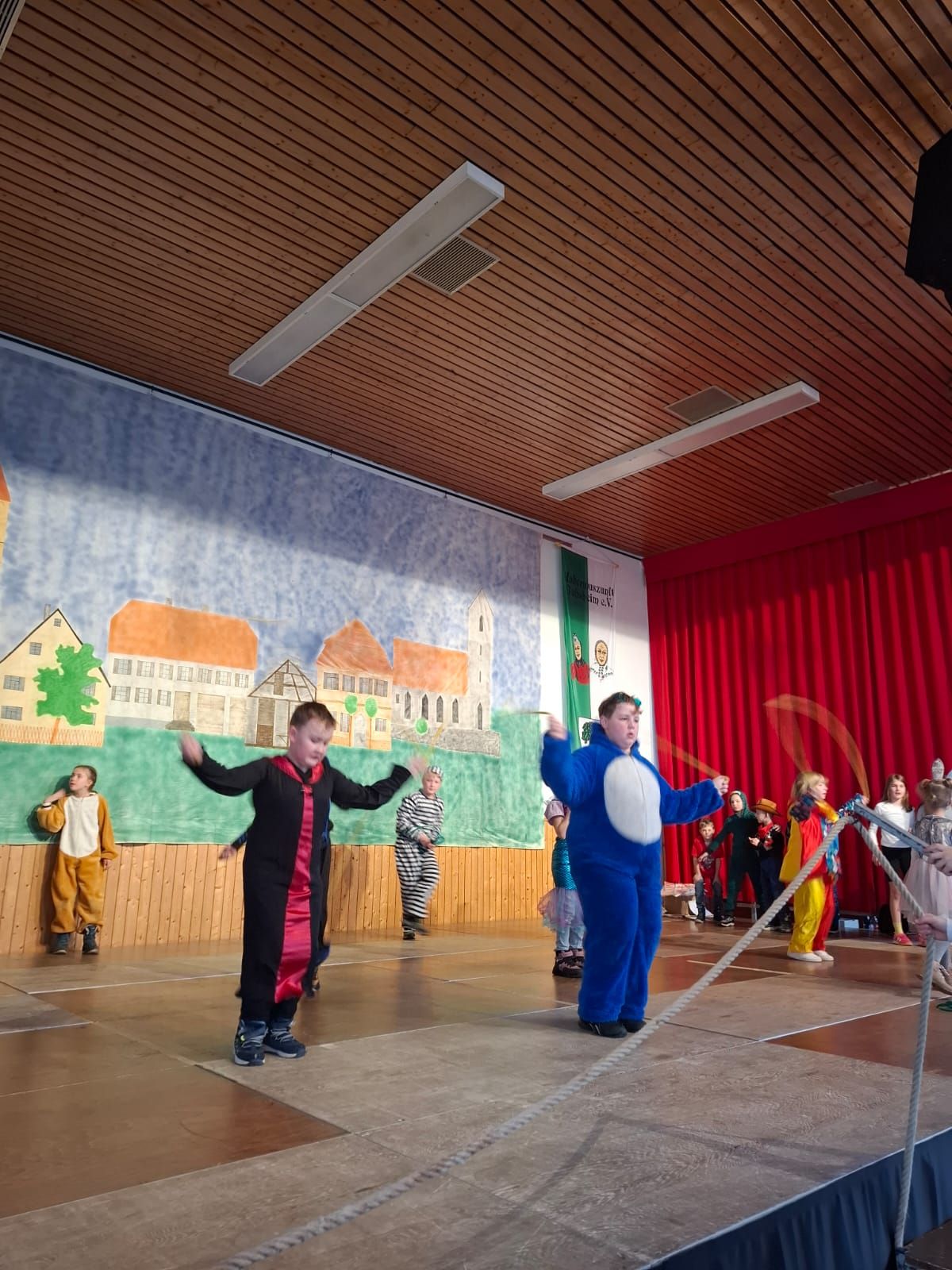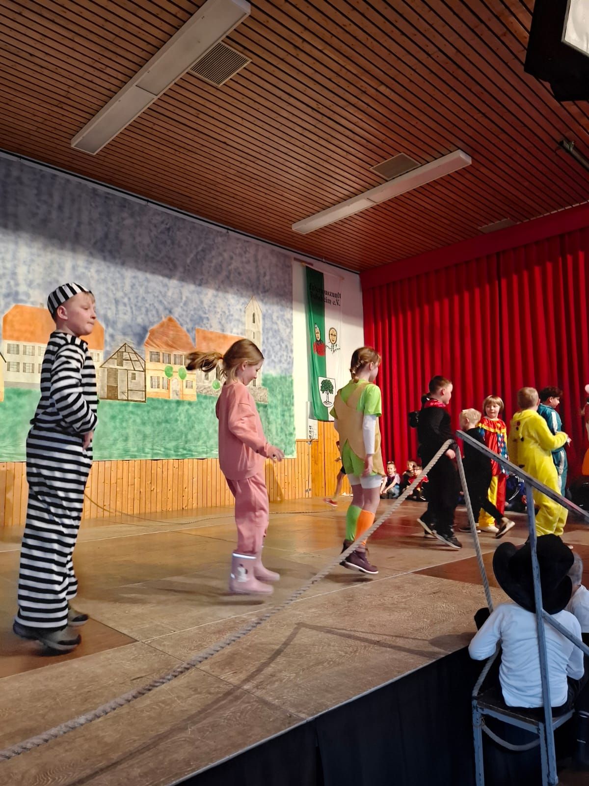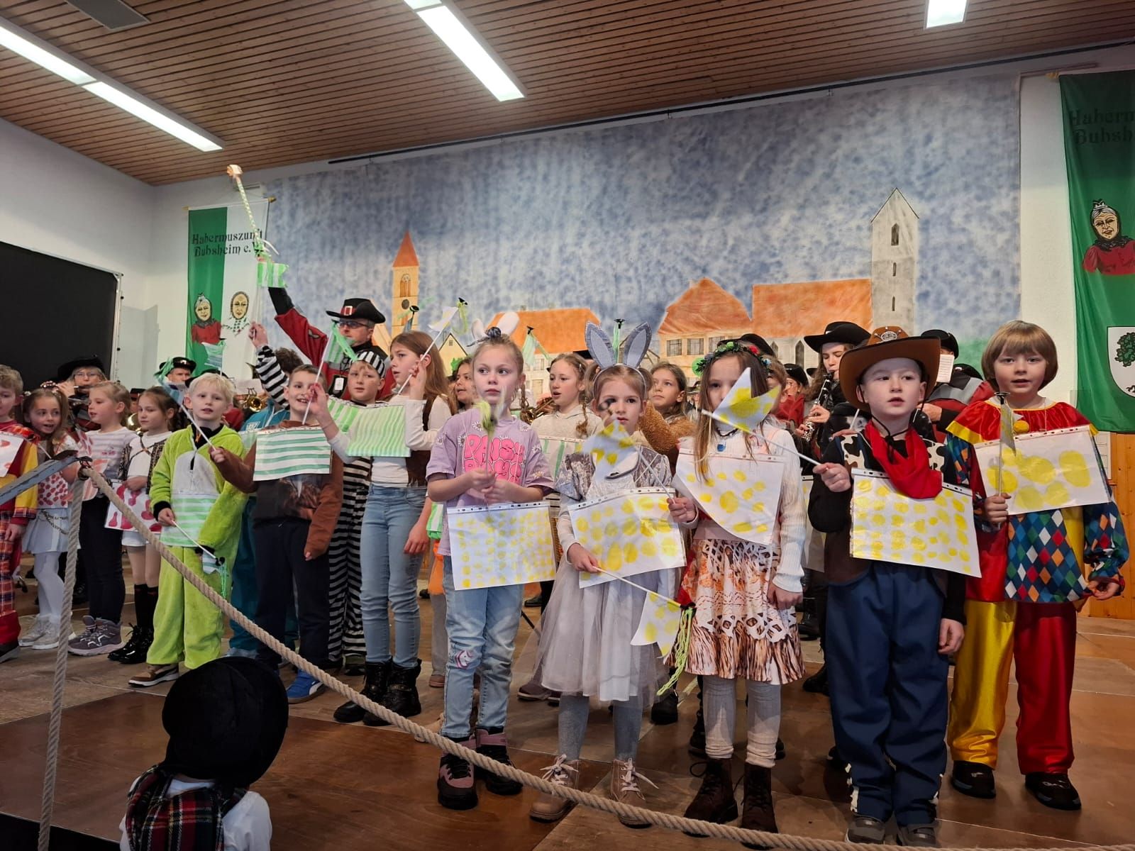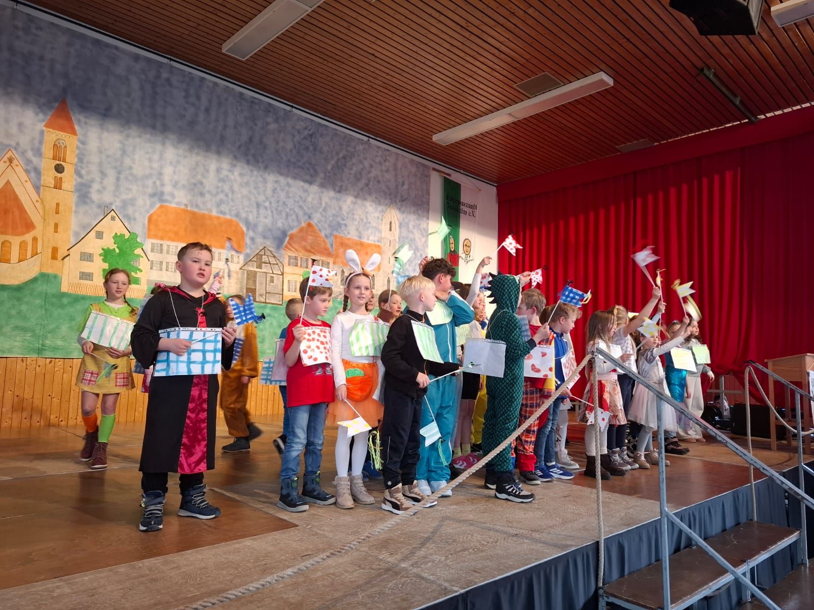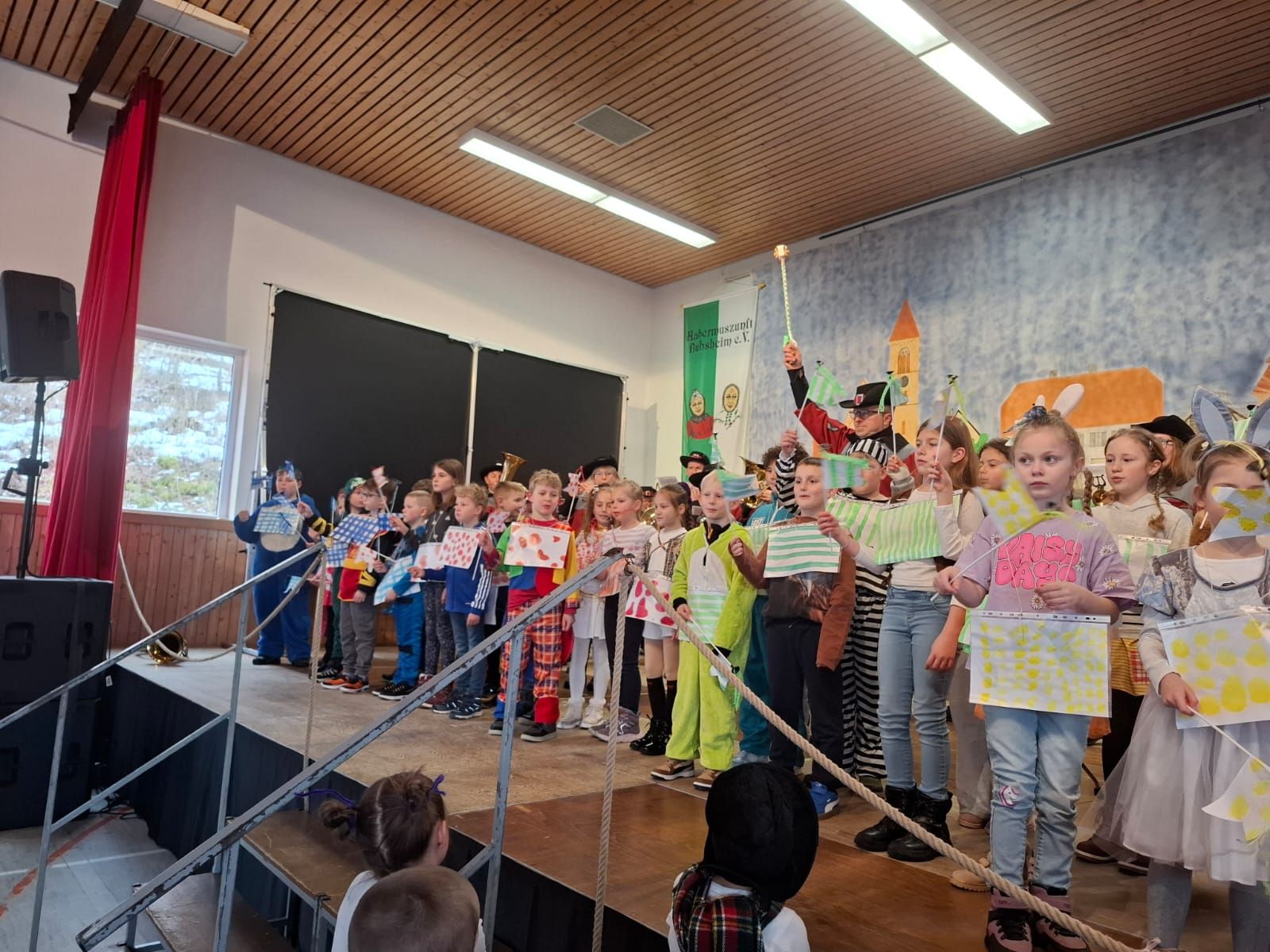 Am Rosenmontag machte sich die Schulgemeinschaft dann auf den Weg zur Halle. In einem kleinen Umzug zogen die Kinder fröhlich dorthin, begleitet von einigen Windböen. Auf der Bühne führten sie das Lied vom Anderssein auf und begeisterten mit einem tollen Tanz das Publikum.