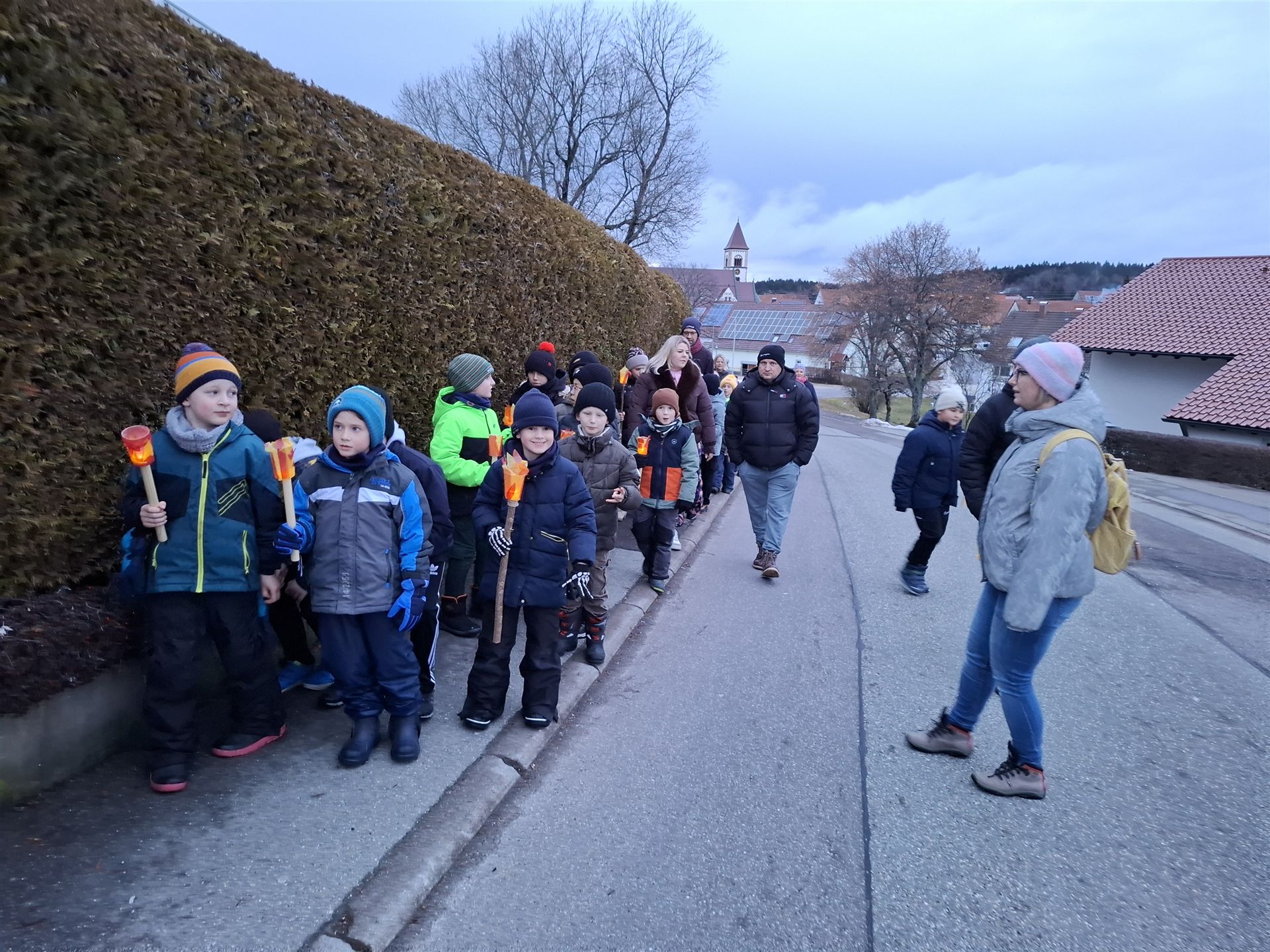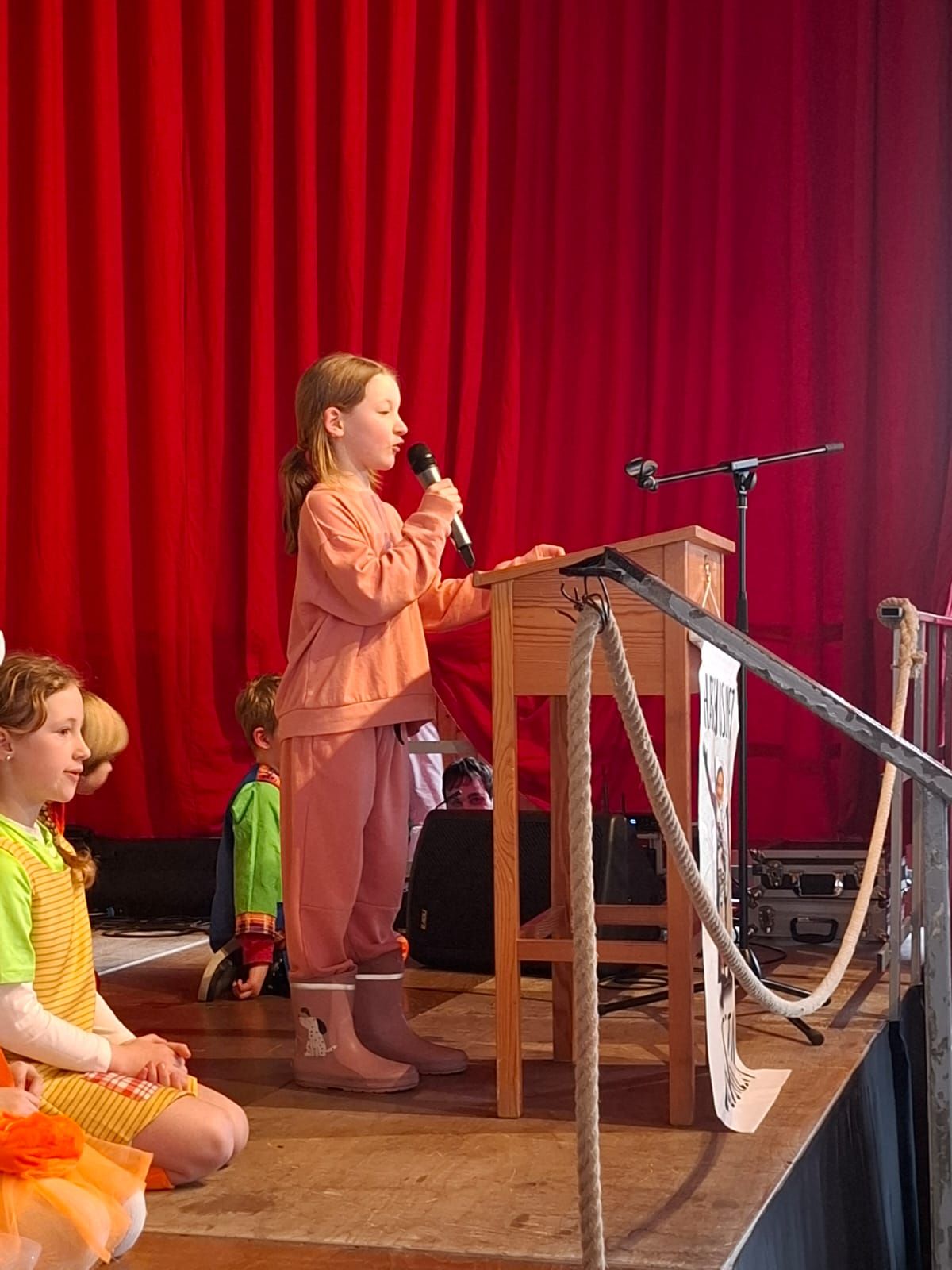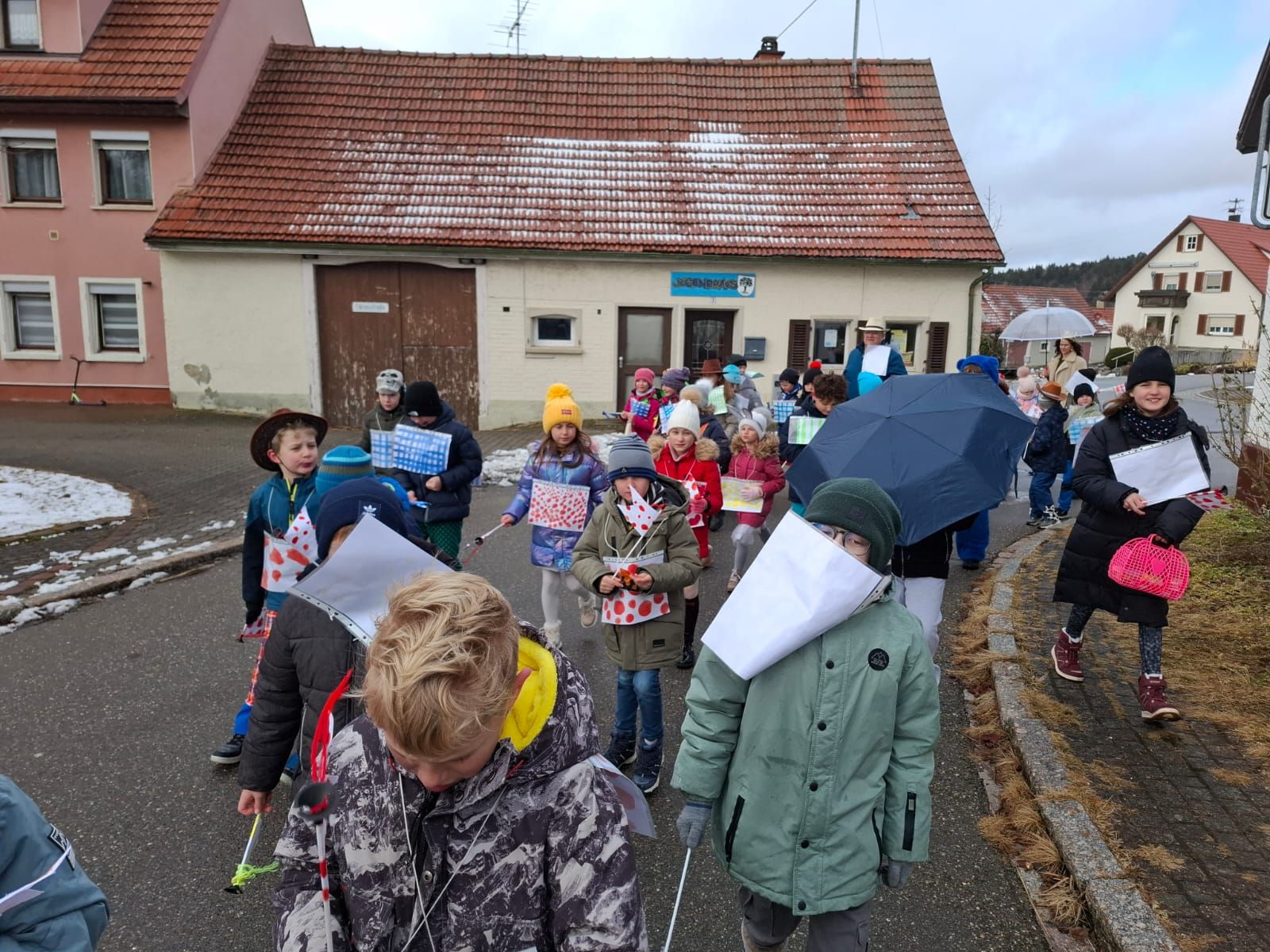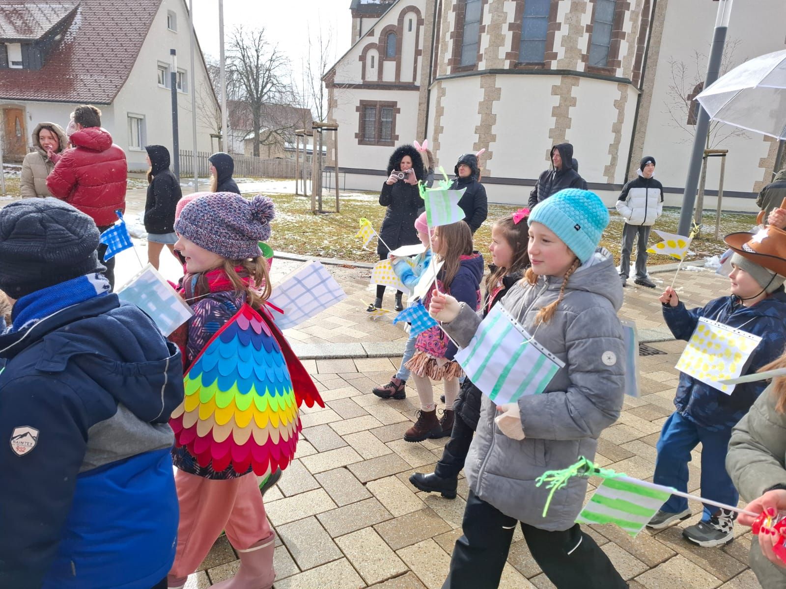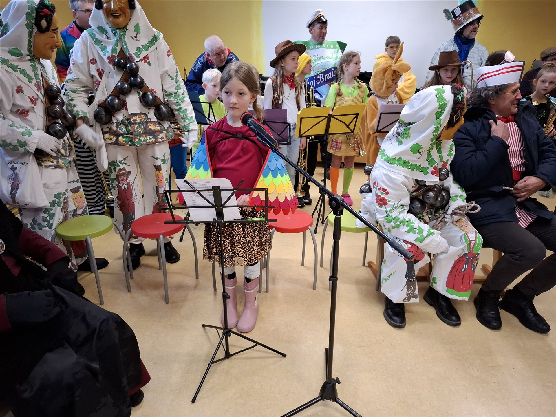Am Rosenmontag machte sich die Schulgemeinschaft dann auf den Weg zur Halle. In einem kleinen Umzug zogen die Kinder fröhlich dorthin, begleitet von einigen Windböen. Auf der Bühne führten sie das Lied vom Anderssein auf und begeisterten mit einem tollen Tanz das Publikum.