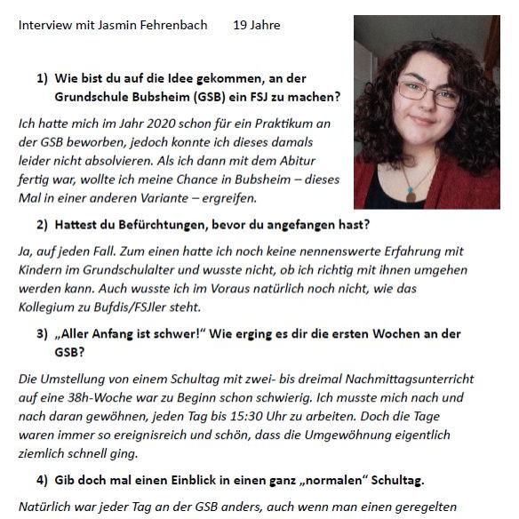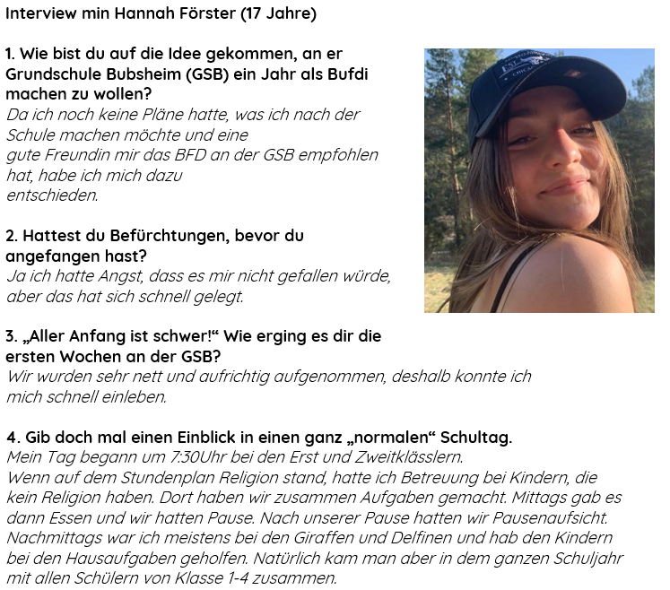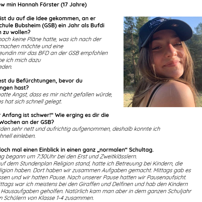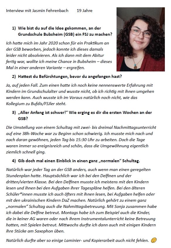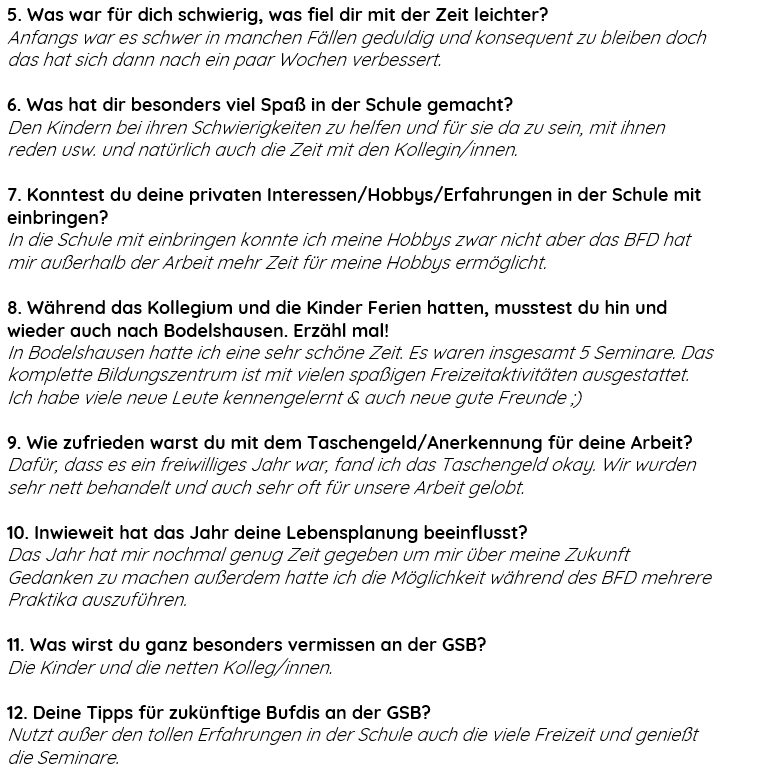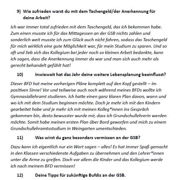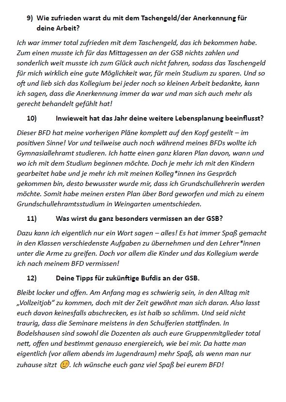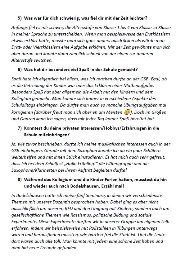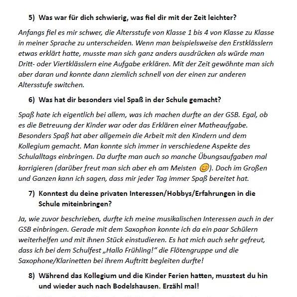 "Spaß hatte ich eigentlich bei allem, was ich machen durfte an der GSB. Egal, ob es die Betreuung der Kinder war oder das Erklären einer Matheaufgabe. Besonders Spaß hat aber allgemein die Arbeit mit den Kindern und den Kolleginnen und Kollegen gemacht. Man konnte sich immer wieder in verschiedene Aspekte des Schulalltags einbringen."