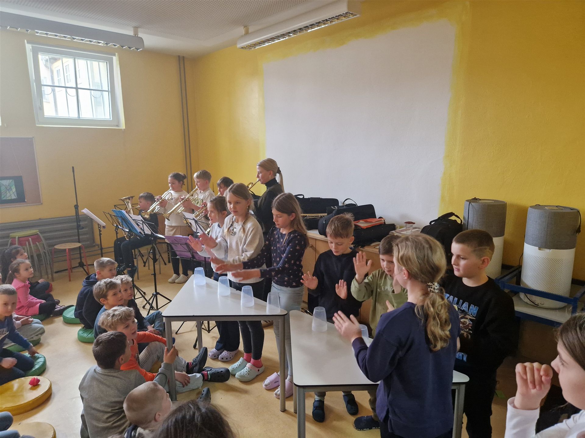 Anschließend schlängelte sich eine lange Polonaise durchs Schulhaus und alle trafen sich zur großen Party im Multiraum. Bei fröhlicher Musik wurde getanzt und gesungen. Für die passende närrische Stimmung sorgte unsere Bläserklasse mit dem traditionellen Narrenmarsch.