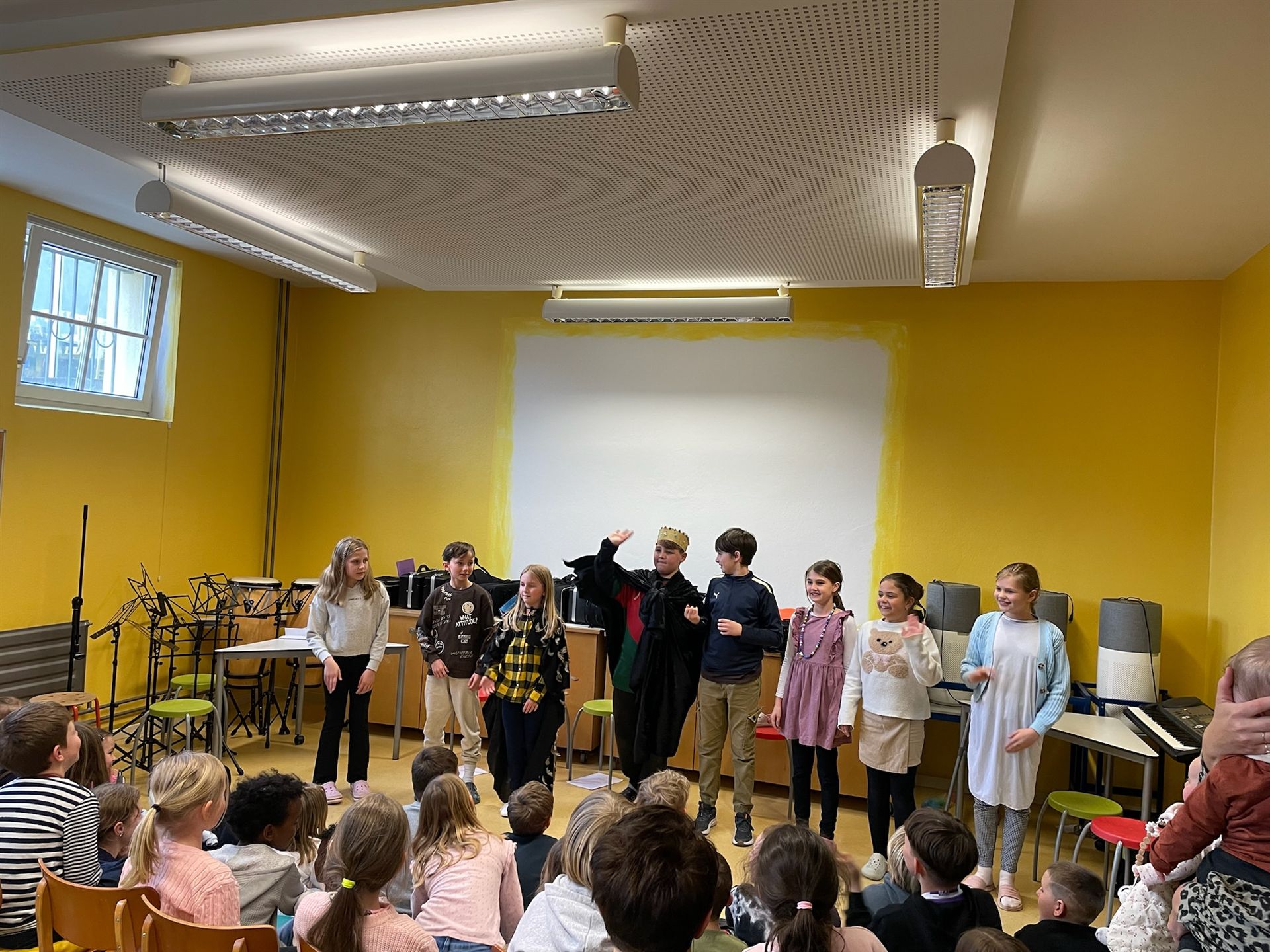 Unsere Viertklässler führten ein Theaterstück auf – die Geschichte vom Raben, der zur Schule will, sorgte für viele Schmunzler und begeisterte nicht nur die Kinder. Auch die Drittklässler trugen mit einem schwungvollen Lied zur festlichen Stimmung bei.