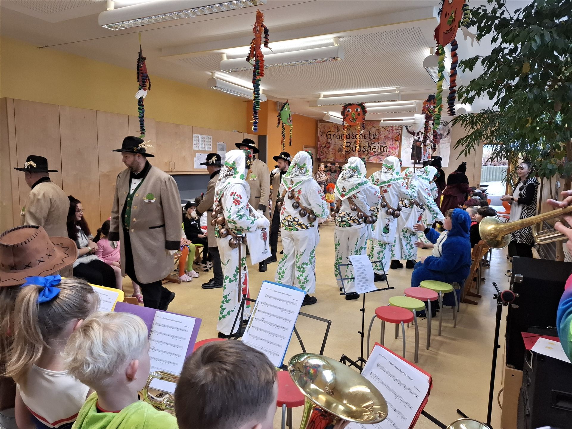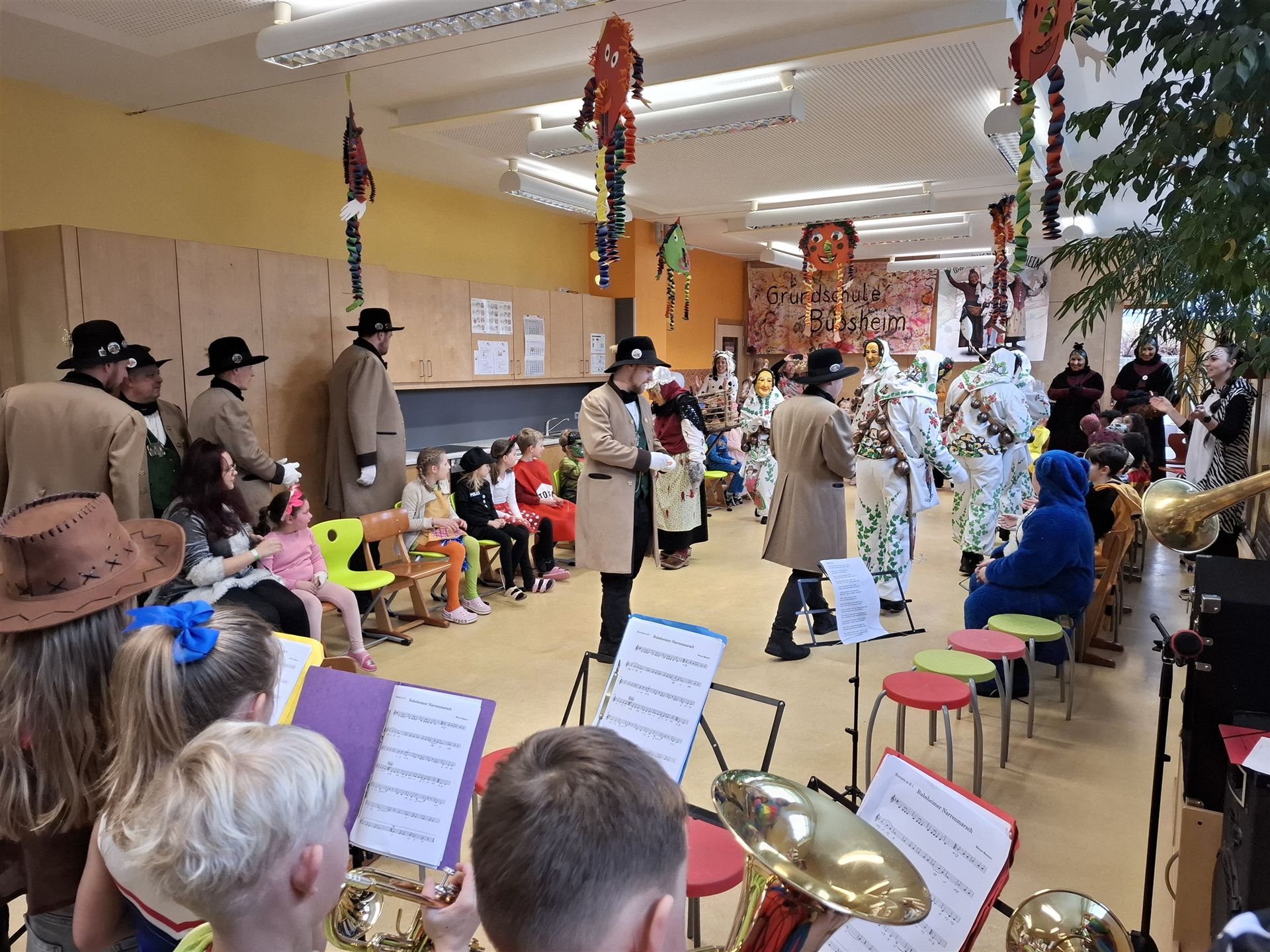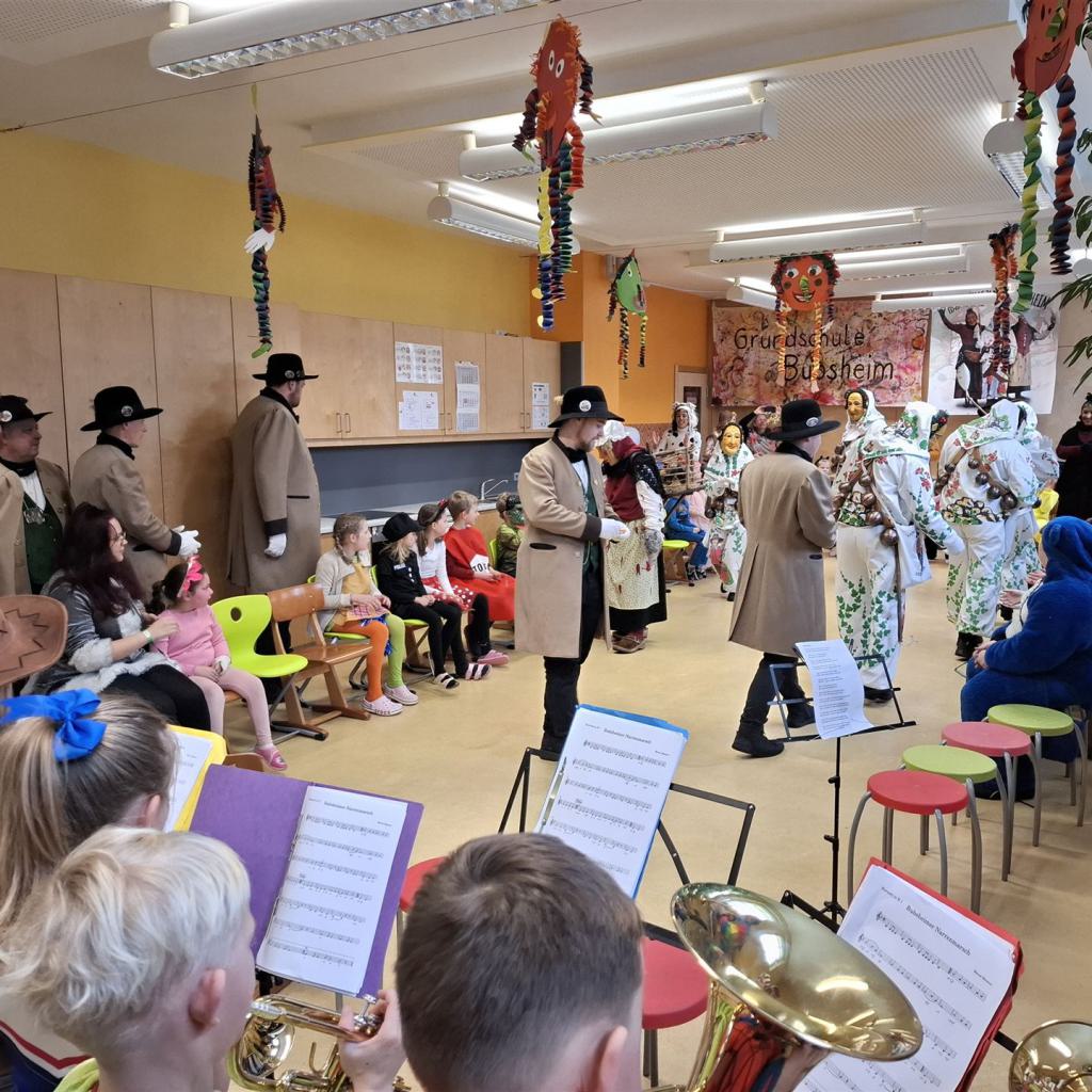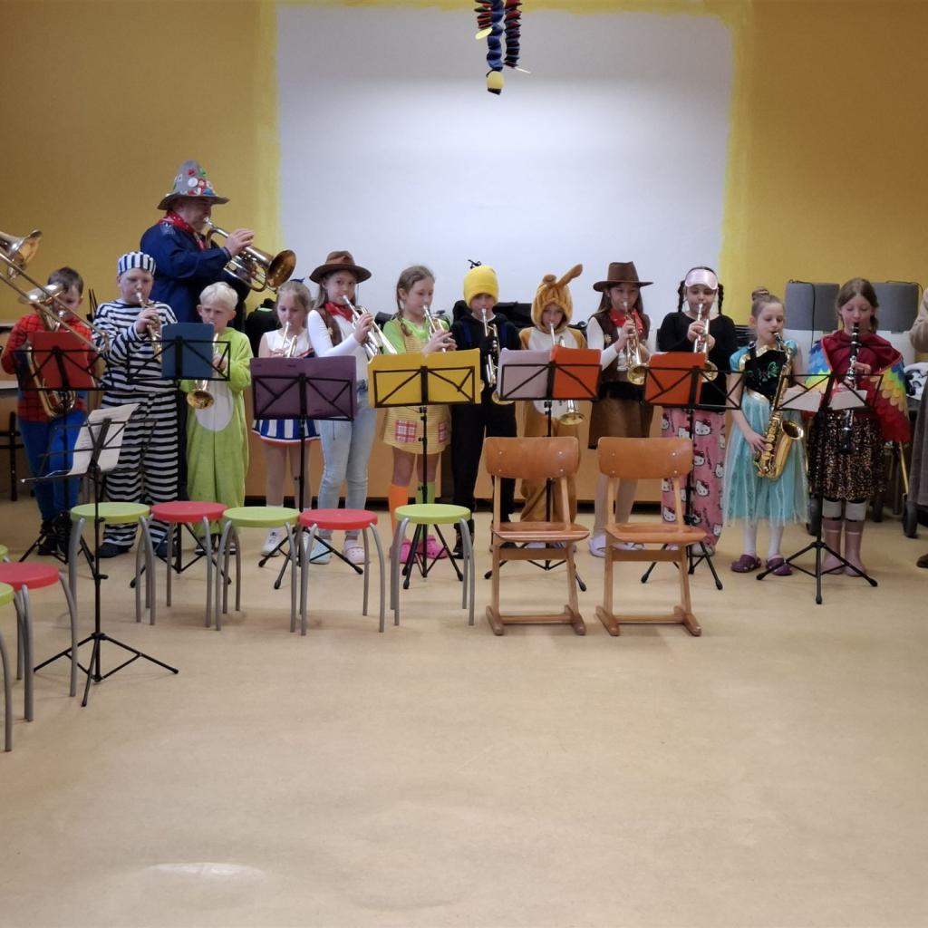 Anschließend schlängelte sich eine lange Polonaise durchs Schulhaus und alle trafen sich zur großen Party im Multiraum. Bei fröhlicher Musik wurde getanzt und gesungen. Für die passende närrische Stimmung sorgte unsere Bläserklasse mit dem traditionellen Narrenmarsch.