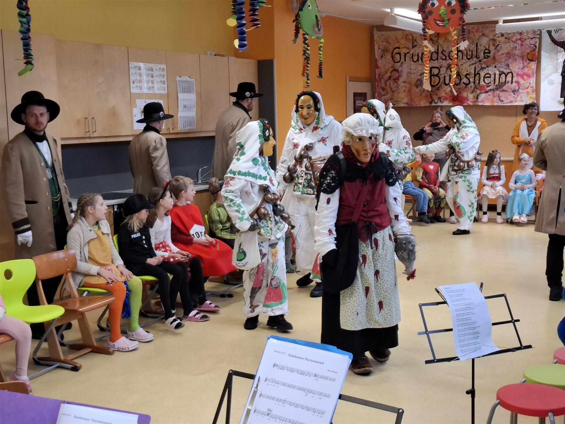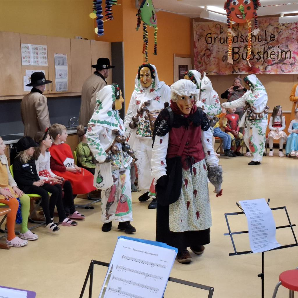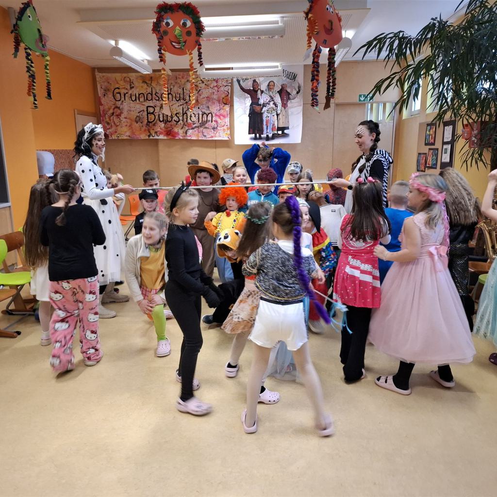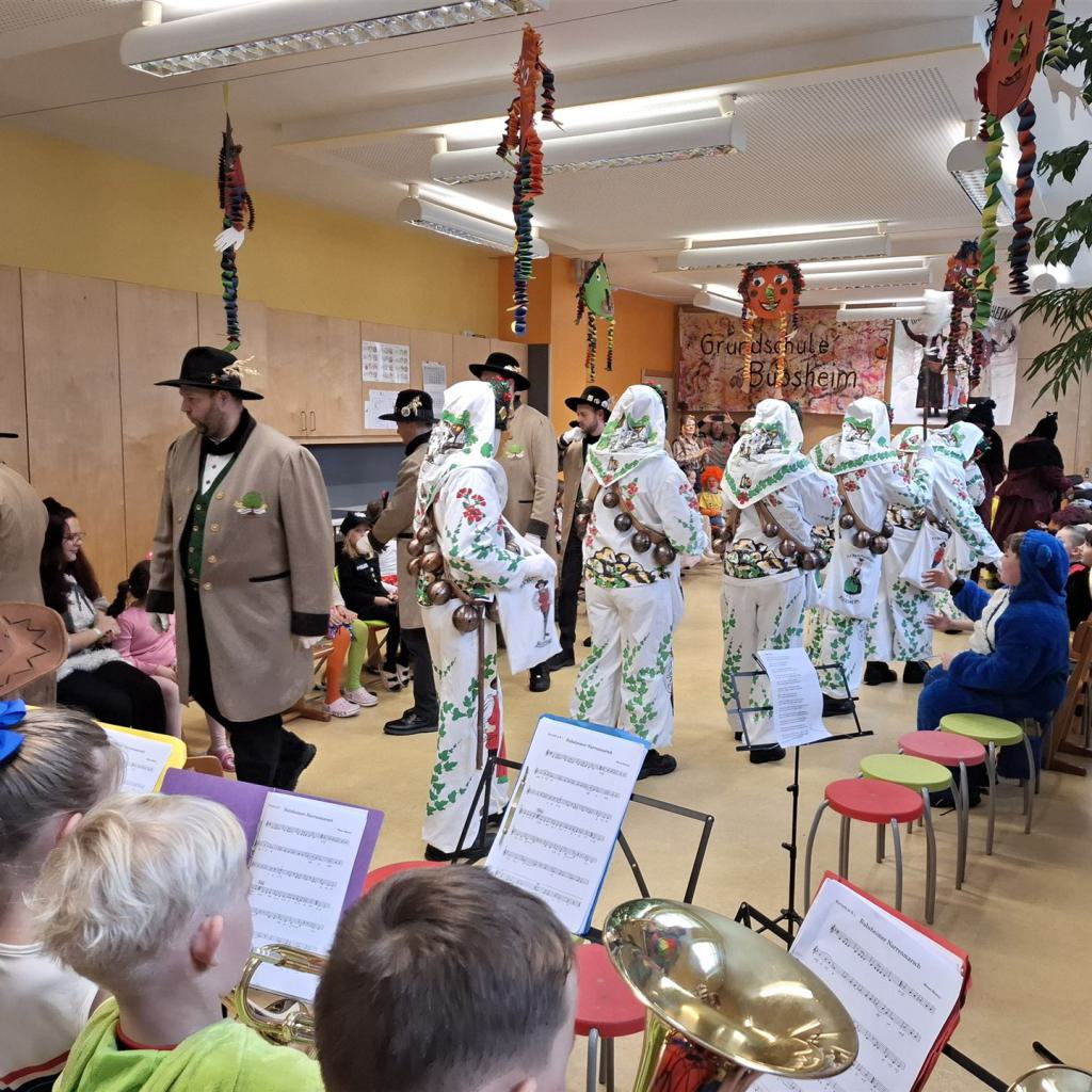 Anschließend schlängelte sich eine lange Polonaise durchs Schulhaus und alle trafen sich zur großen Party im Multiraum. Bei fröhlicher Musik wurde getanzt und gesungen. Für die passende närrische Stimmung sorgte unsere Bläserklasse mit dem traditionellen Narrenmarsch.