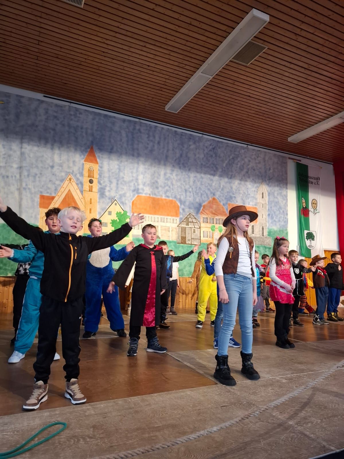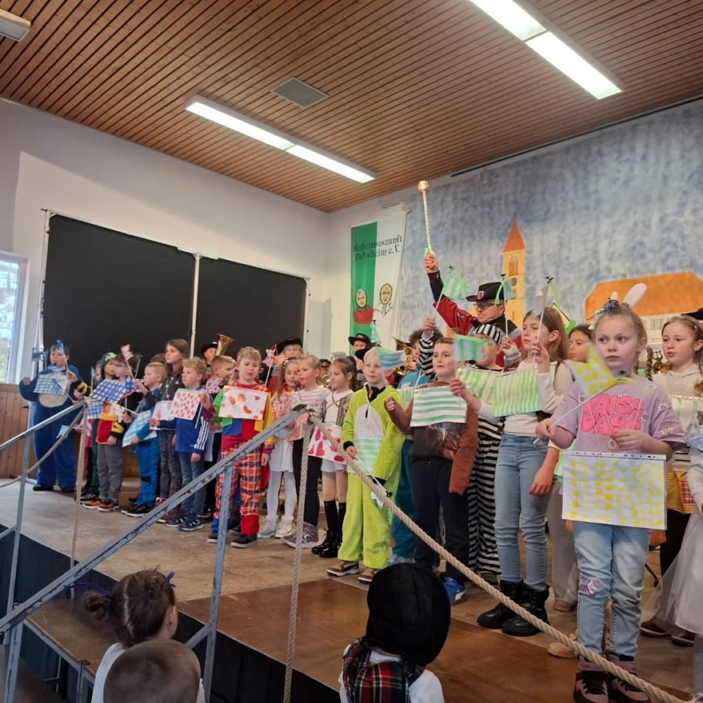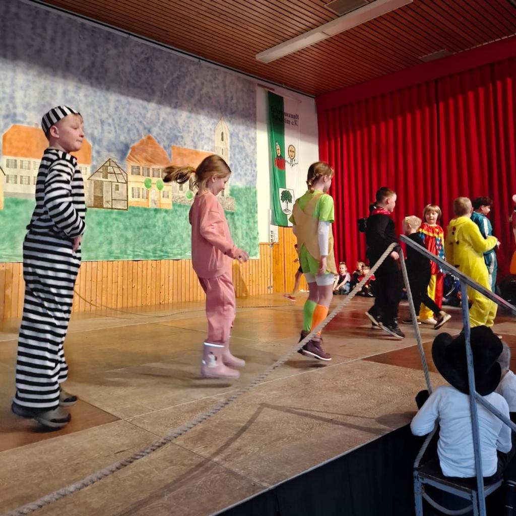 Am Rosenmontag machte sich die Schulgemeinschaft dann auf den Weg zur Halle. In einem kleinen Umzug zogen die Kinder fröhlich dorthin, begleitet von einigen Windböen. Auf der Bühne führten sie das Lied vom Anderssein auf und begeisterten mit einem tollen Tanz das Publikum.