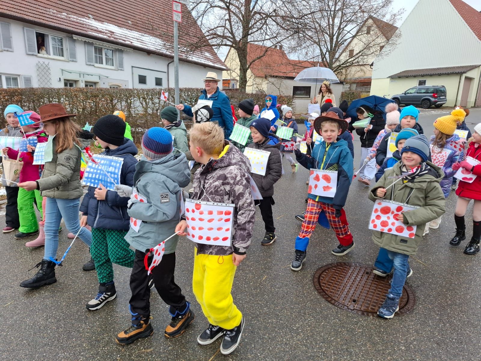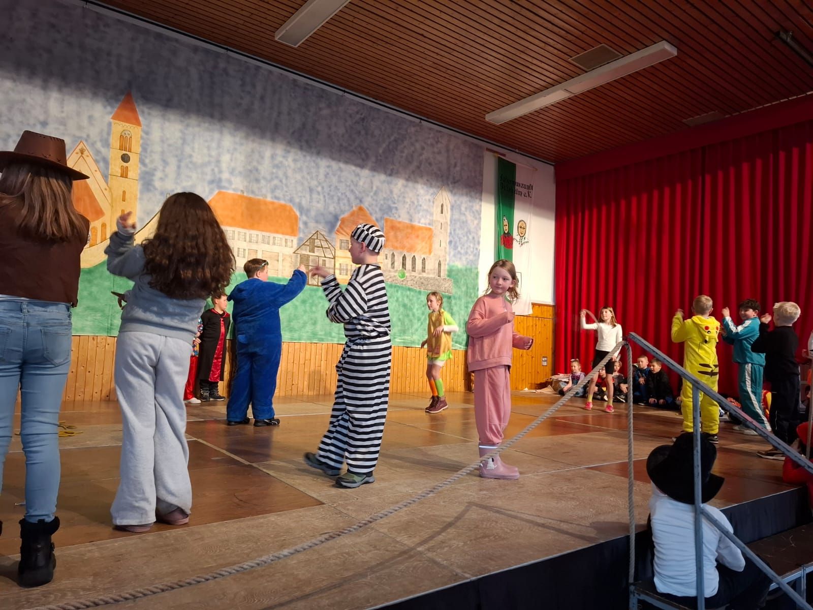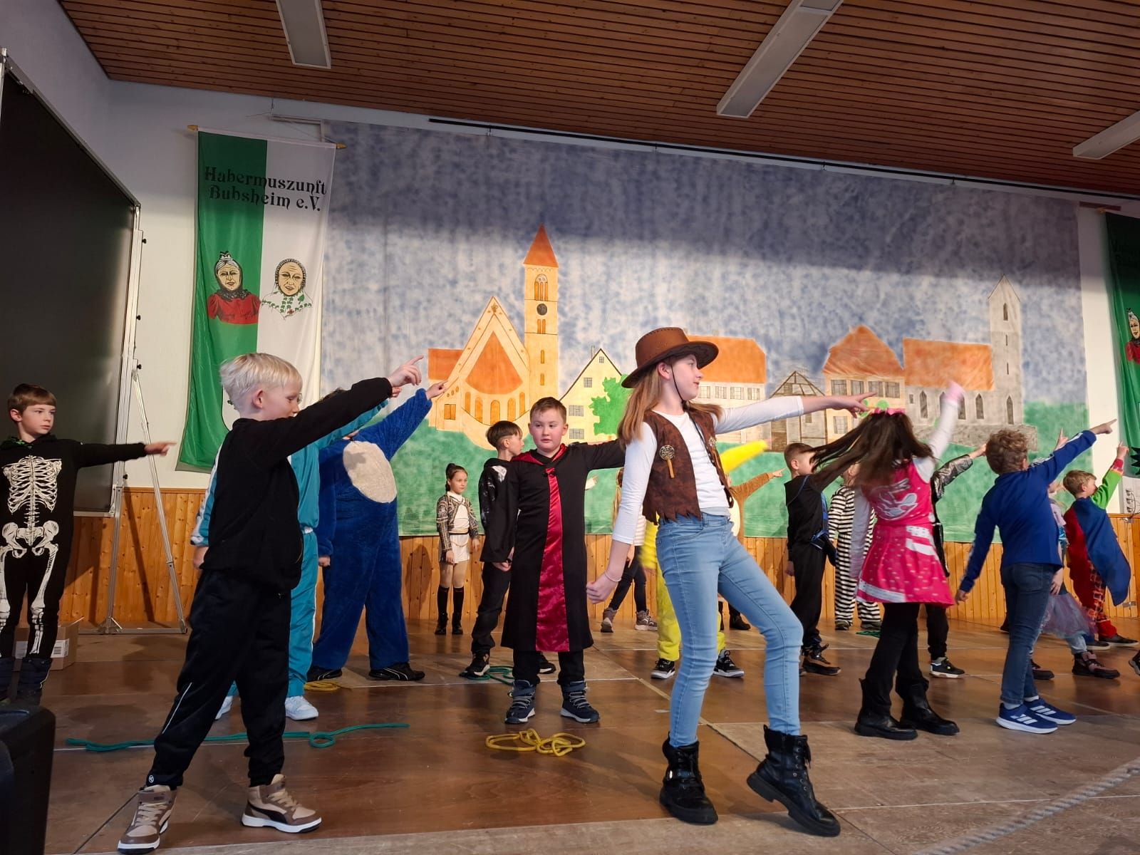 Am Rosenmontag machte sich die Schulgemeinschaft dann auf den Weg zur Halle. In einem kleinen Umzug zogen die Kinder fröhlich dorthin, begleitet von einigen Windböen. Auf der Bühne führten sie das Lied vom Anderssein auf und begeisterten mit einem tollen Tanz das Publikum.